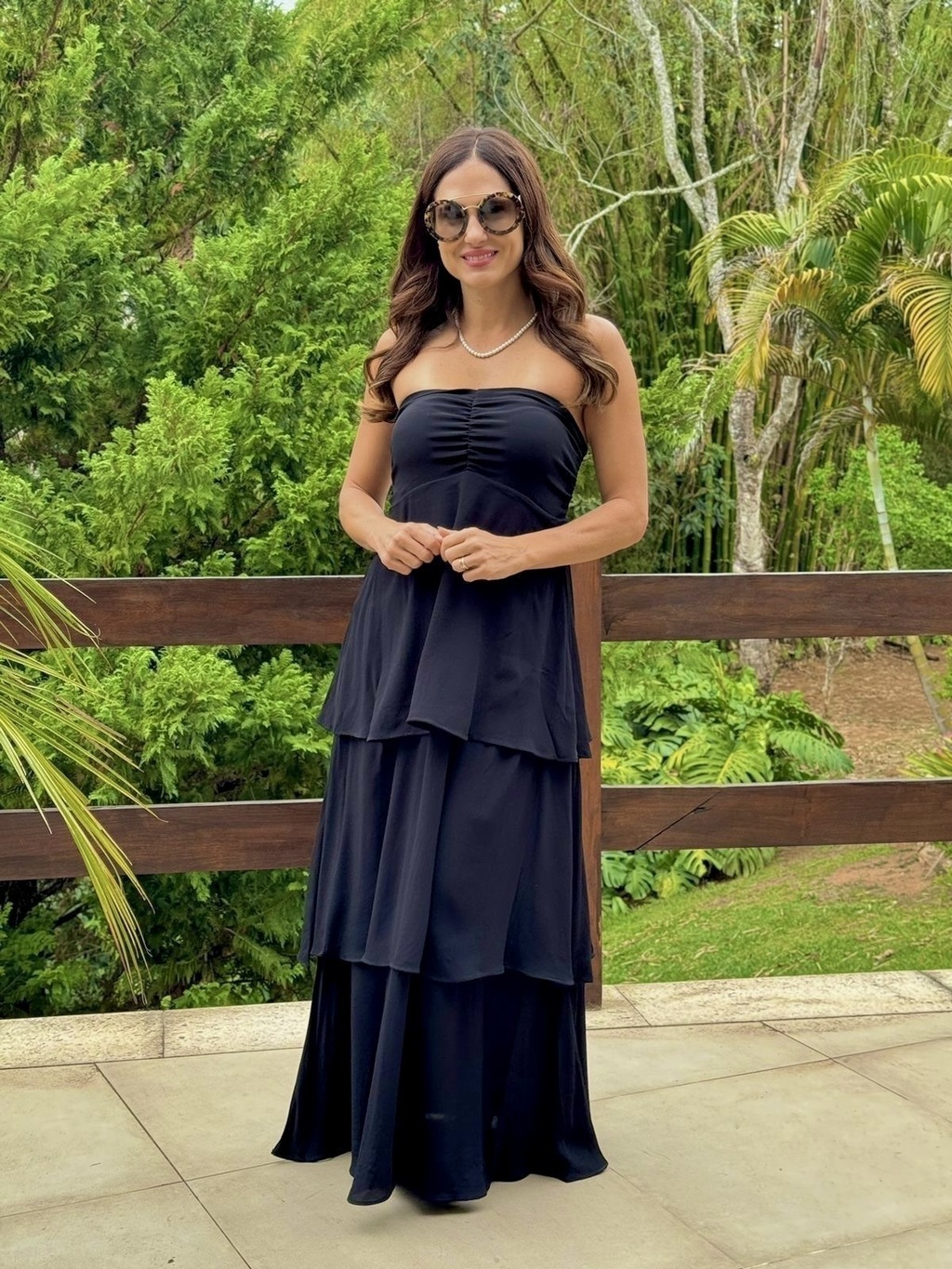 O Vestido Amélia tem comprimento longo e um busto no estilo tomara que caia. Para garantir mais conforto e ajuste perfeito no corpo, a parte das costas conta com um detalhe em lastex. A saia apresenta três camadas de babado, trazendo à peça um toque de elegância e sofisticação.